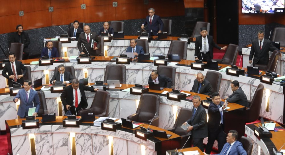 据悉,土团党美丹花园州议员阿菲夫及轰埠州议员海里森哈山在议会内持续抗议,随后被议长刘永山下令驱逐。反对党领袖拿督斯里阿兹敏阿里随后率领反对党集体离席抗议。