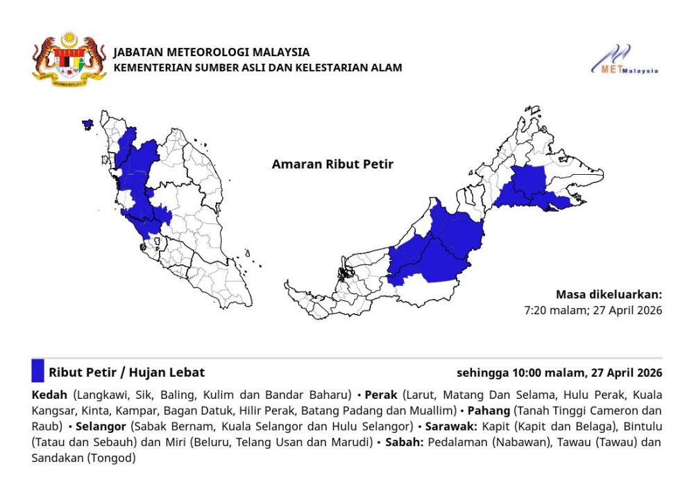 马来西亚气象局(MET Malaysia)于今日(27日)晚上7时20分发出最新紧急雷雨预警。根据监测显示,由于多地雷雨带活跃,原定晚间结束的恶劣天气预计将进一步延长至晚上10时。