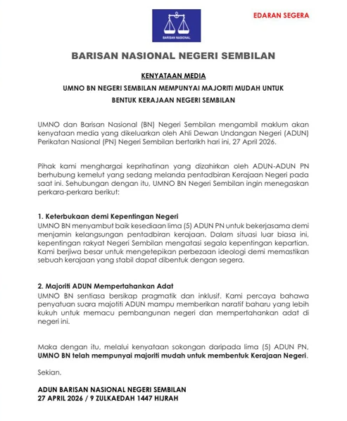 这份由“森美兰国阵州议员”署名的媒体文告指出,森州巫统与国阵已知悉森州国盟州议员于今日发表的声明,并感谢对方愿意合作,以确保州政府行政能够继续运作。