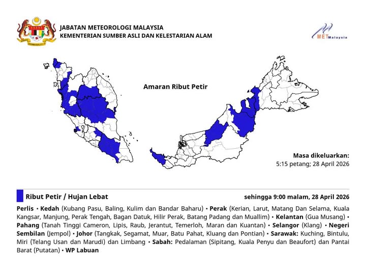 气象部门发布最新雷暴预警,预计强雷暴、暴雨及强风将影响马来西亚多州地区,天气状况可能持续至今晚9时。