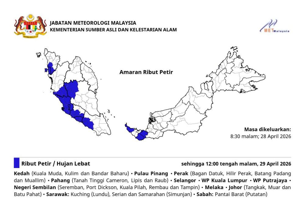 马来西亚气象局(MET Malaysia)于今日(28日)晚上8时30分发布了今日入夜后最长一次的预警:预计强风、暴雨及闪电将持续肆虐,直到明日(29日,周三)凌晨12时。