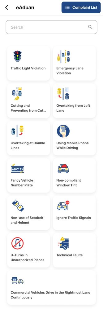 操作方式相当简单。用户进入MyJPJ首页后,点击“eAduan”选项,选择对应的违规类别,再上传影像证据并填写相关资料,确认后提交即可。整个过程可在手机上快速完成,无需亲自到相关单位处理。