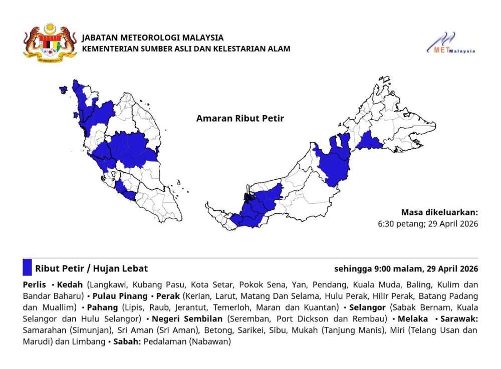 马来西亚气象局于2026年4月29日发布最新雷暴警报,指国内多州预计将出现雷暴、大雨及强风天气,警报有效期至今晚9时。