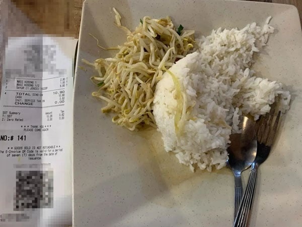 一碟白饭加豆芽竟要价(10令吉90仙),让一名正在减肥的男子大感意外,也在社交媒体引发网民热议。